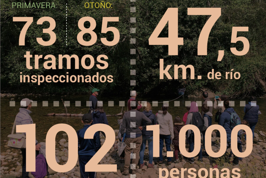 Cada equipo de voluntariado visita su tramo de río dos veces al año, en mayo y en octubre. En esos periodos realizamos una serie de observaciones según una metodología común, descrita en el manual de inspección de ríos, empleando los mismos materiales. Con ello obtenemos una valiosa información que después se analiza, resume y difunde en el informe anual.